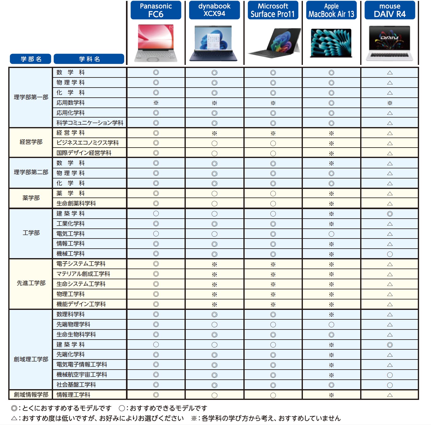 指定スペックを踏まえた学科別おすすめ機種一覧