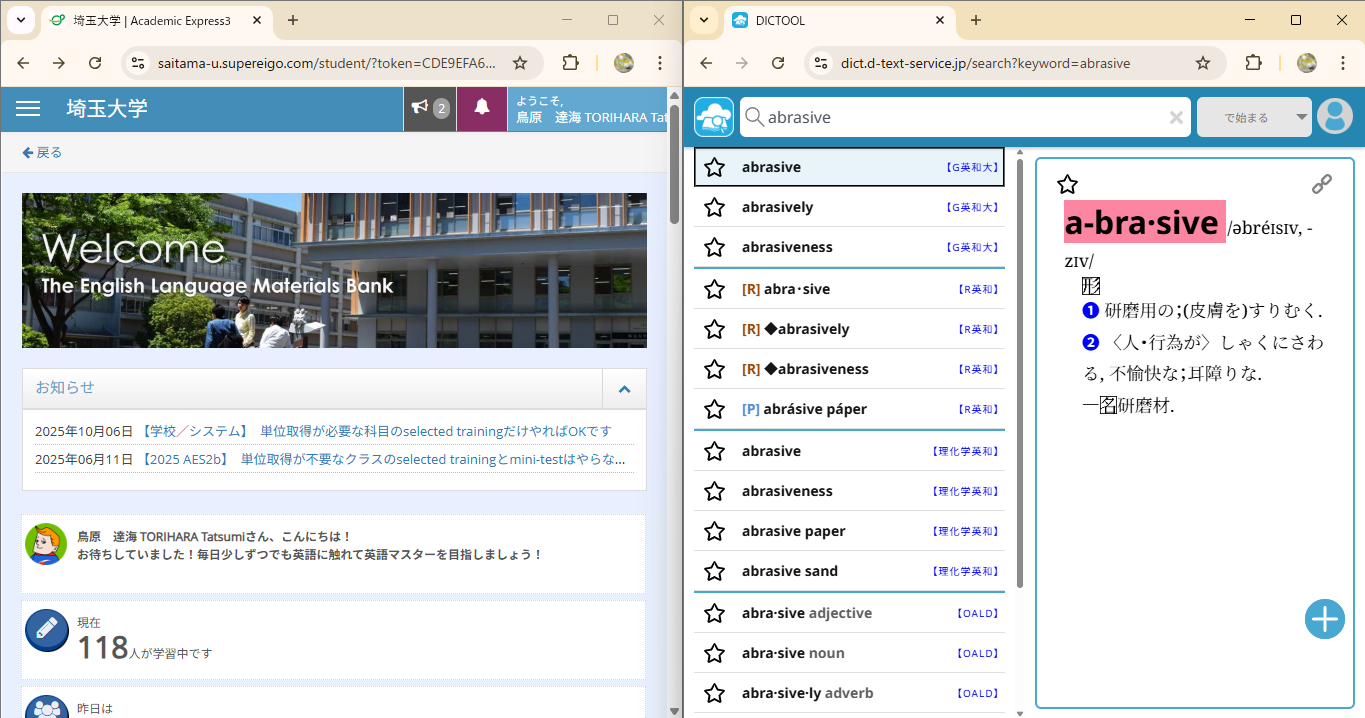 - DICTOOLは、英語学習を効率的に進めるために重要なツールで、大学が提供する学習サイトと組み合わせることで、その効果を最大限に引き出すことができます。私の主な学習法は、二画面表示による単語学習です。PC画面の片側に大学提供の英語学習サイトを開き、もう一方にDICTOOLを表示させます。一方で英語学習を進めつつ、知らない単語に遭遇したらもう一方のDICTOOLで検索し、その場で意味や用法を確認します。さらに、調べた単語をそのままDICTOOLの単語帳に登録する流れを繰り返すことで、オリジナルの単語集を作成できます。この単語帳は、後に定期的な復習に活用することで、語彙力の定着に非常に役立っています。