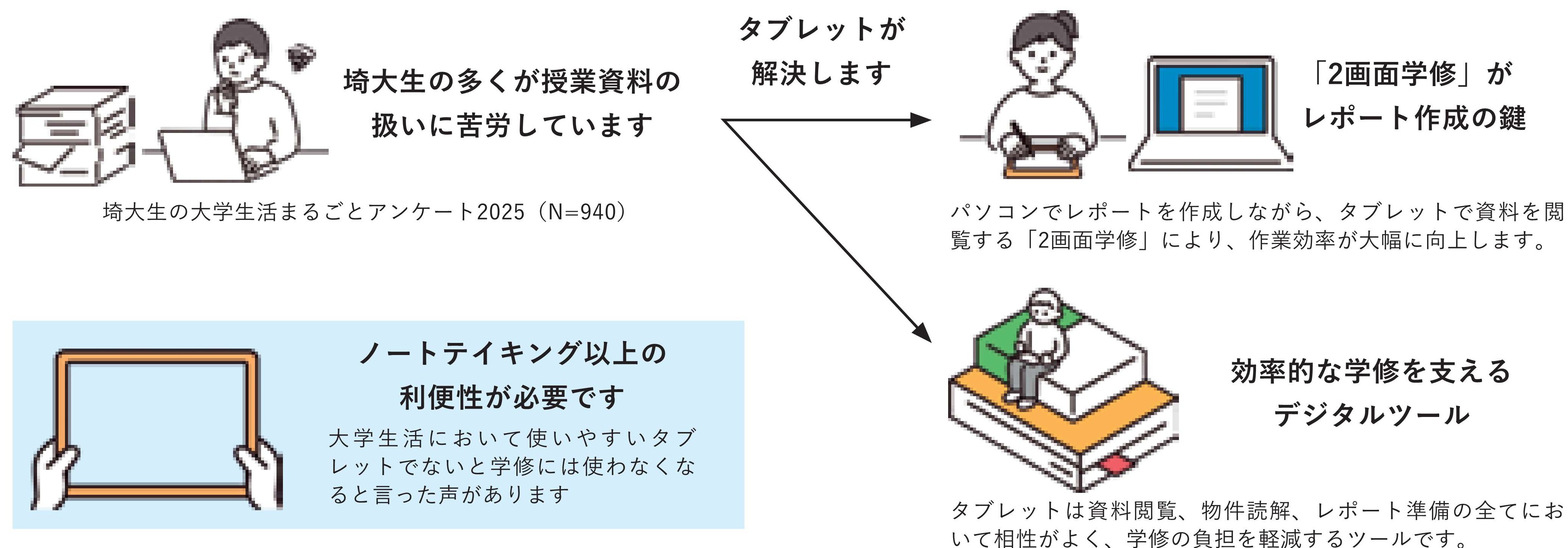 料の整理が大変” “読解に時間がかかる” “PCだけでは画面が足りない” といった学修上の悩みを抱えていることが分かっています。タブレットはこうした負担を軽くするツールで、特に資料閲覧・文献読解・レポート準備との相性がとても良い点が特徴です。