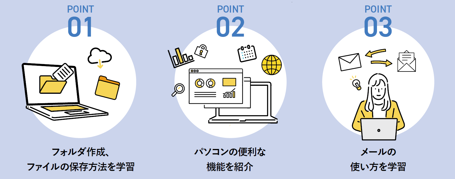 - データの保存方法、フォルダの作り方など…パソコン操作の基本を学習