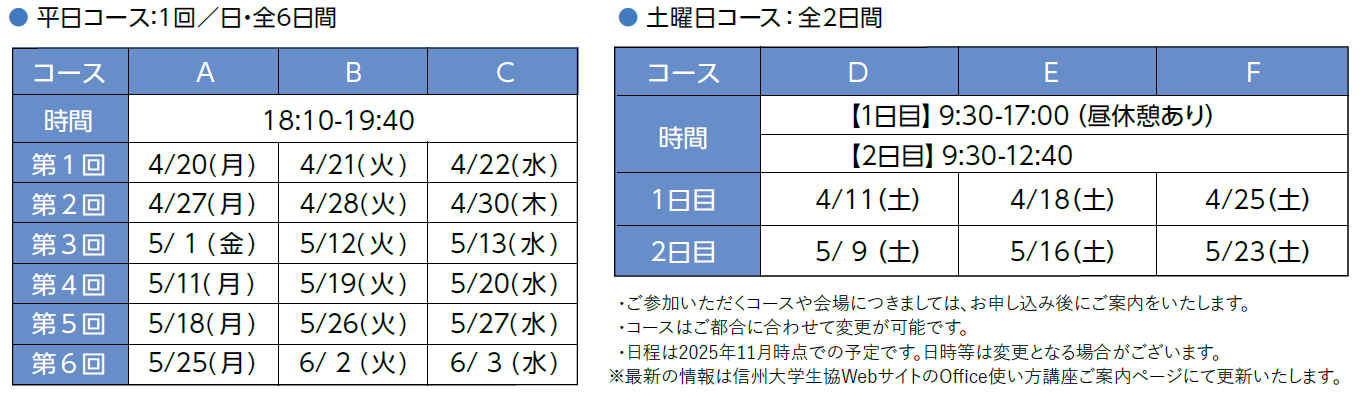 信州大学生協では、学習レベルごとに2種類のパソコン講座を開催します。
