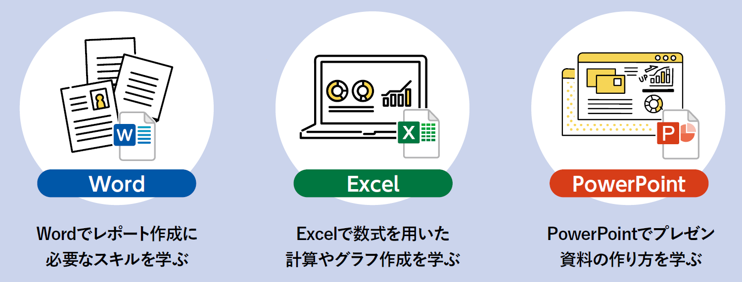 - Word, Excel, PowerPointなど…大学で必須となるOfficeソフトの使い方を学習