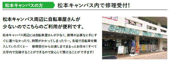 生協販売の自転車は、松本キャンパスにある生協店舗で修理受付が可能なため、突然のパンクなどもしもの際にも安心です。