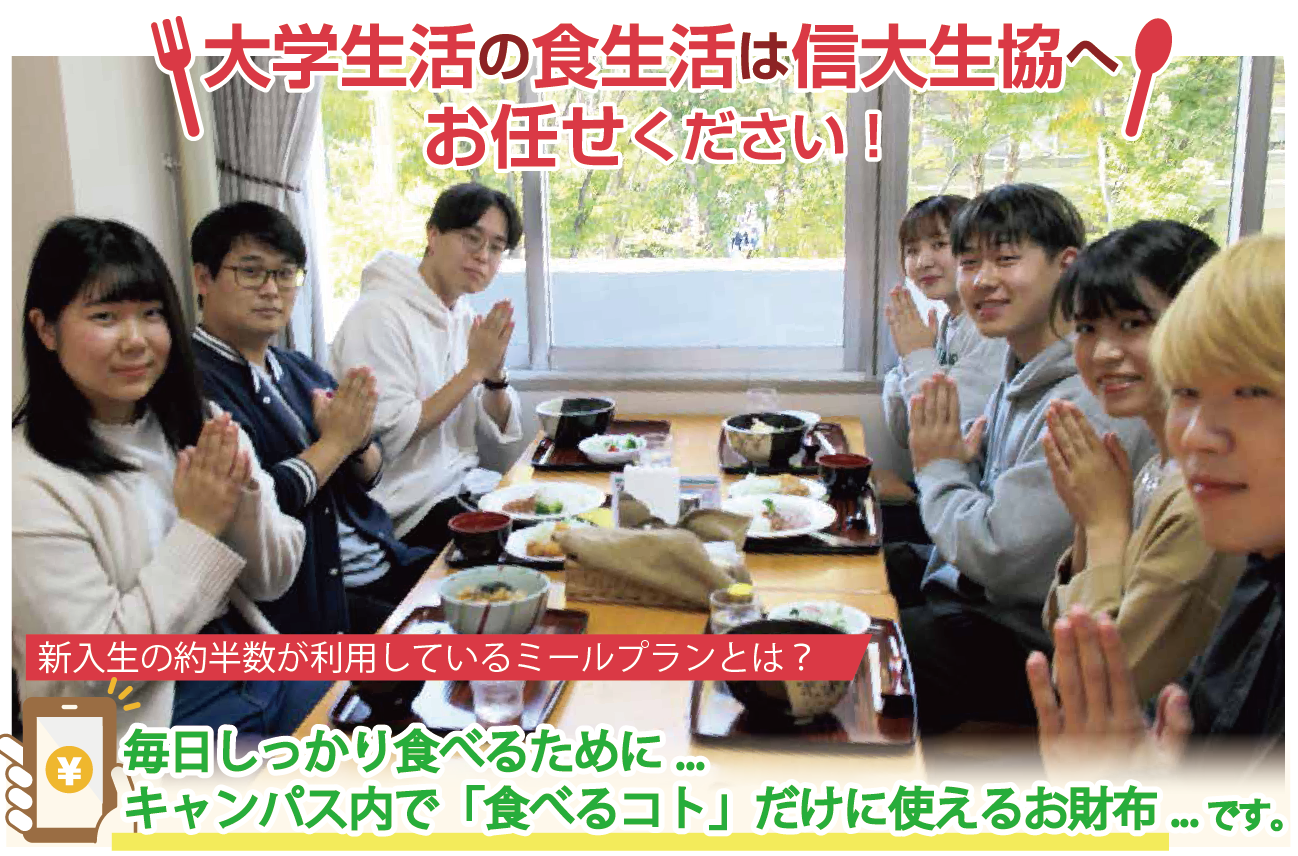 たくなる場面が多いですが、食事を抜くと体調を崩すこともあります。ミールプランなら、毎日、決まった金額が自動的にチャージされるので、「お金の心配をせずに、栄養バランスの取れた食事をしっかり食べる」ことができます。健康な食生活で、勉強もサークルも思いっきり楽しめます。