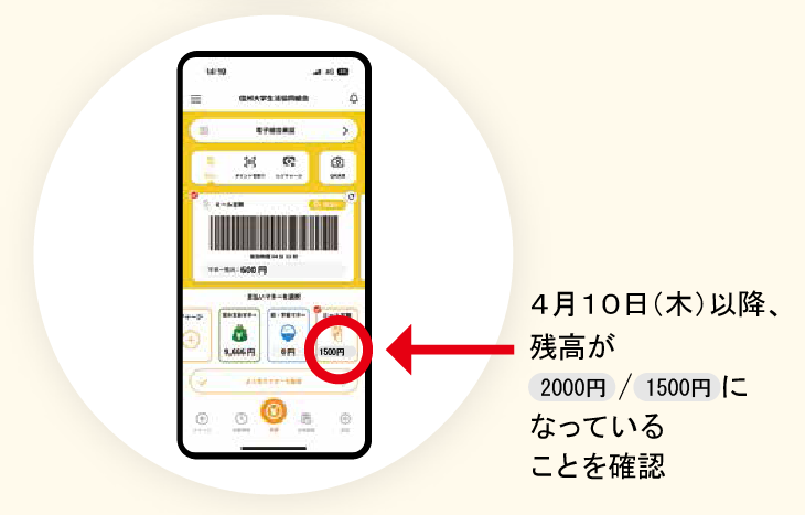- 2月19日(金)より前に、最大利用額分をすべて使い切った場合、以降はご利用出来ません。この場合は信大生協マネーをご利用ください。
