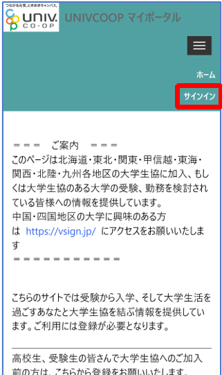 ①UNIVCOOPマイポータルにアクセスして[三]メニューより[サインイン]
