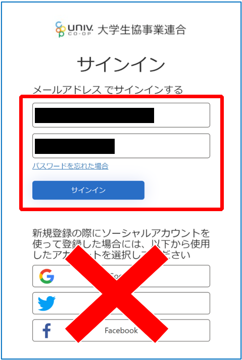 ※Google以下ソーシャルアカウントではログイン出来ません(後に不具合が起こるので試みないでください)。