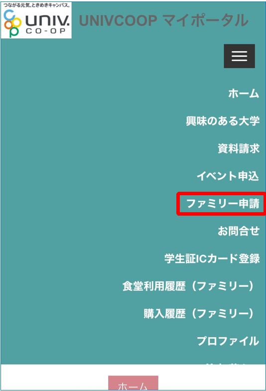 ③サインインできたら[三]メニューから[ファミリー申請]を選択