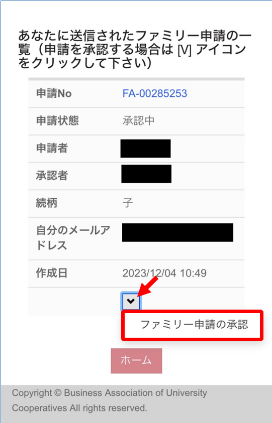 ④保護者からの申請[V]から[ファミリー申請の承認]