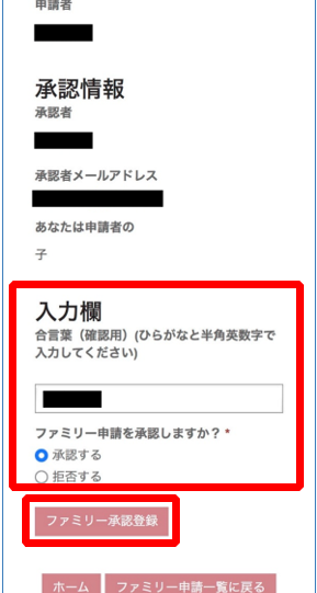 ⑤保護者から伝えられた合言葉を入力して[ファミリー承認登録]→[承認する]