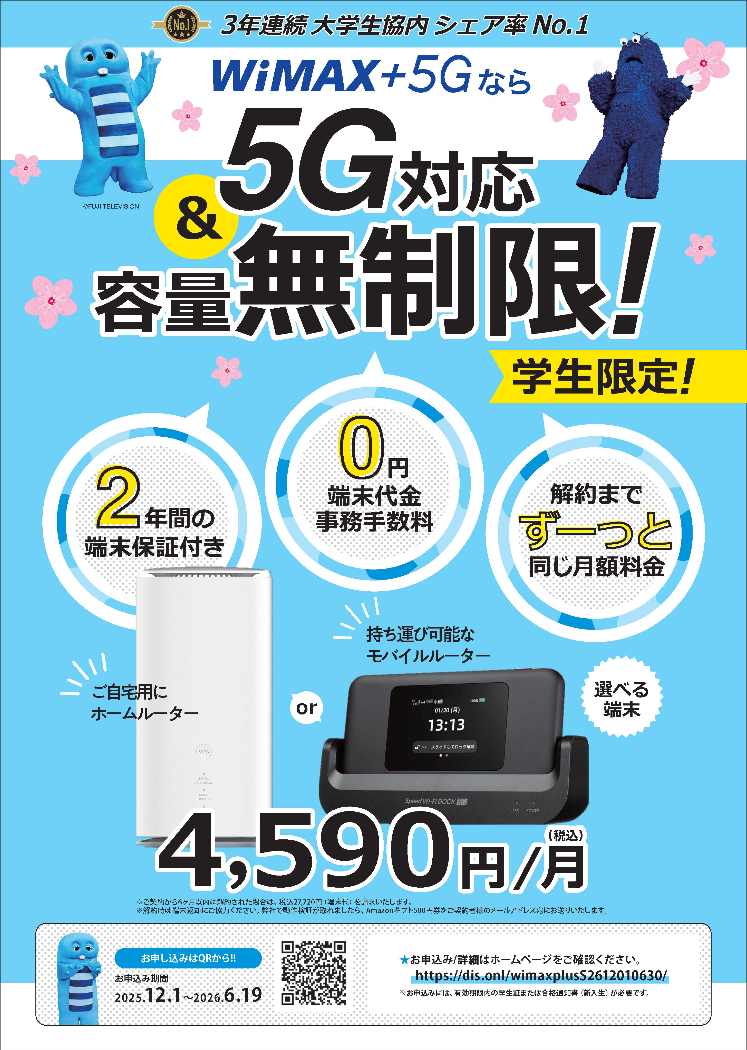 故障・破損などで修理をしている期間にパソコンが必要という方のために、在学中(4年間)代替機の貸し出しを無料で行っています。