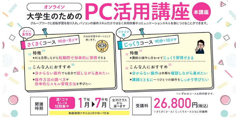 レポート作成に欠かせない「Word」、データ処理・グラフ作成に必須の「Excel」、プレゼンテーション・研究発表で使用する「PowerPoint」などのアプリケーションはもちろんのこと、OneDriveやTeamsなどのオンラインサービスも使用できます。また新機能についても定期的に提供され常に最新の状況で使用することができます。