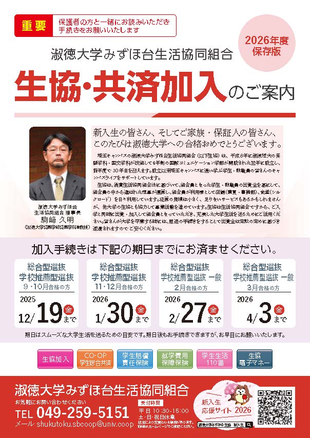 キャンパスでの生活では、仲間と共に食べる食事、学びに必要な教材な文具、日用品やちょっとした食品の購入など、日常的にお金を使う場面があります。淑徳大学埼玉キャンパスでこうしたニーズに応えているのが、淑徳大学みずほ台生協です。生協は,消費生活協同組合法という法律に基づいて設置されるものです。そして本生協は、加入してくれている学生の皆さん、教職員の皆さんの出資金によって運営されています。つまり、このキャンパスに集う私たち自身が自らのキャンパスにおける生活をより豊かにするために、この生協を設置して運営しているのです。