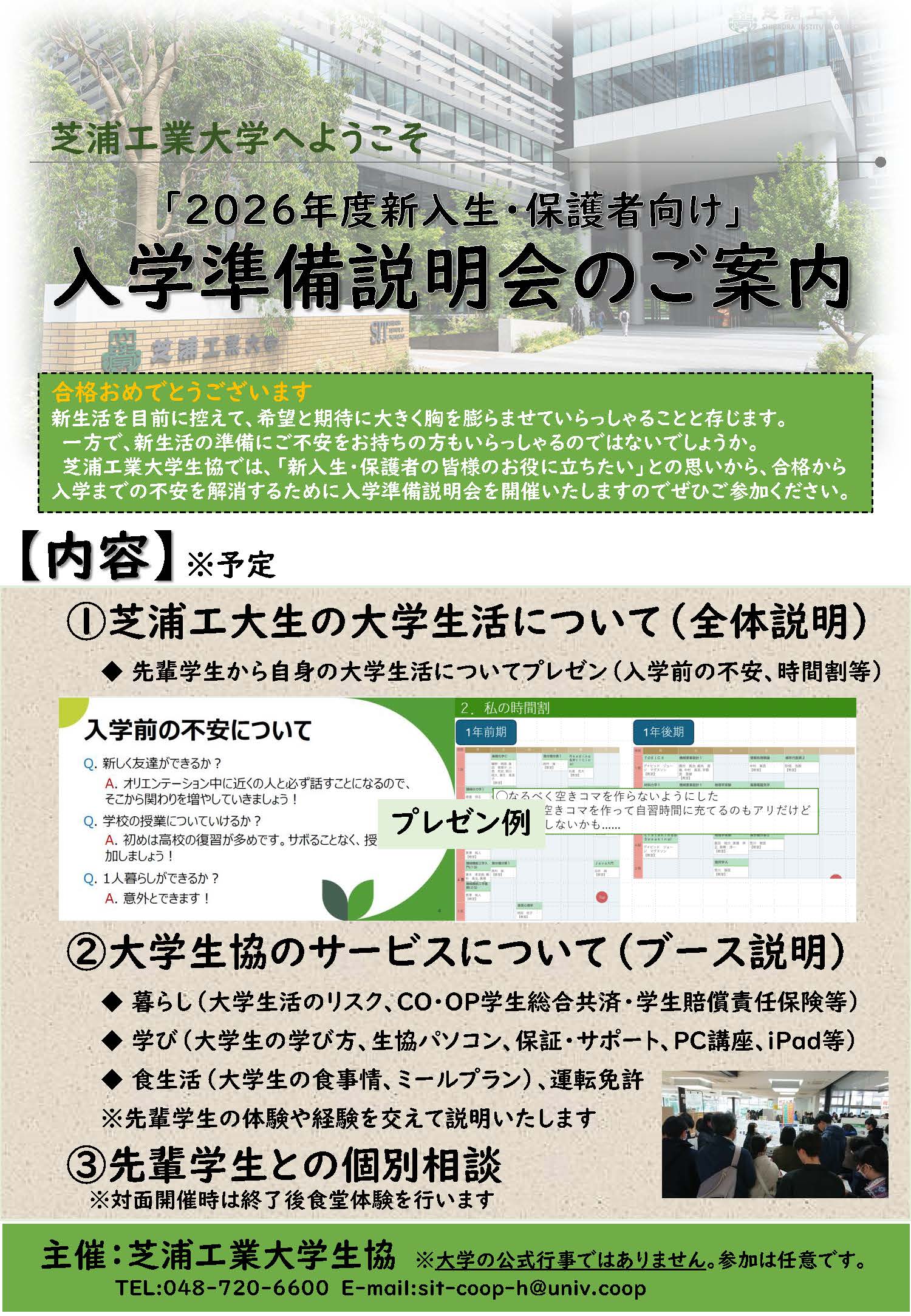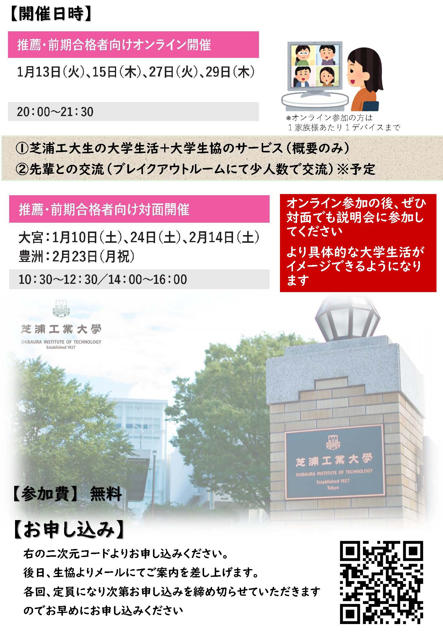 このたび、芝浦工大生の大学生活事情や入学準備のための必要事項が確認できる説明会をご用意しました。