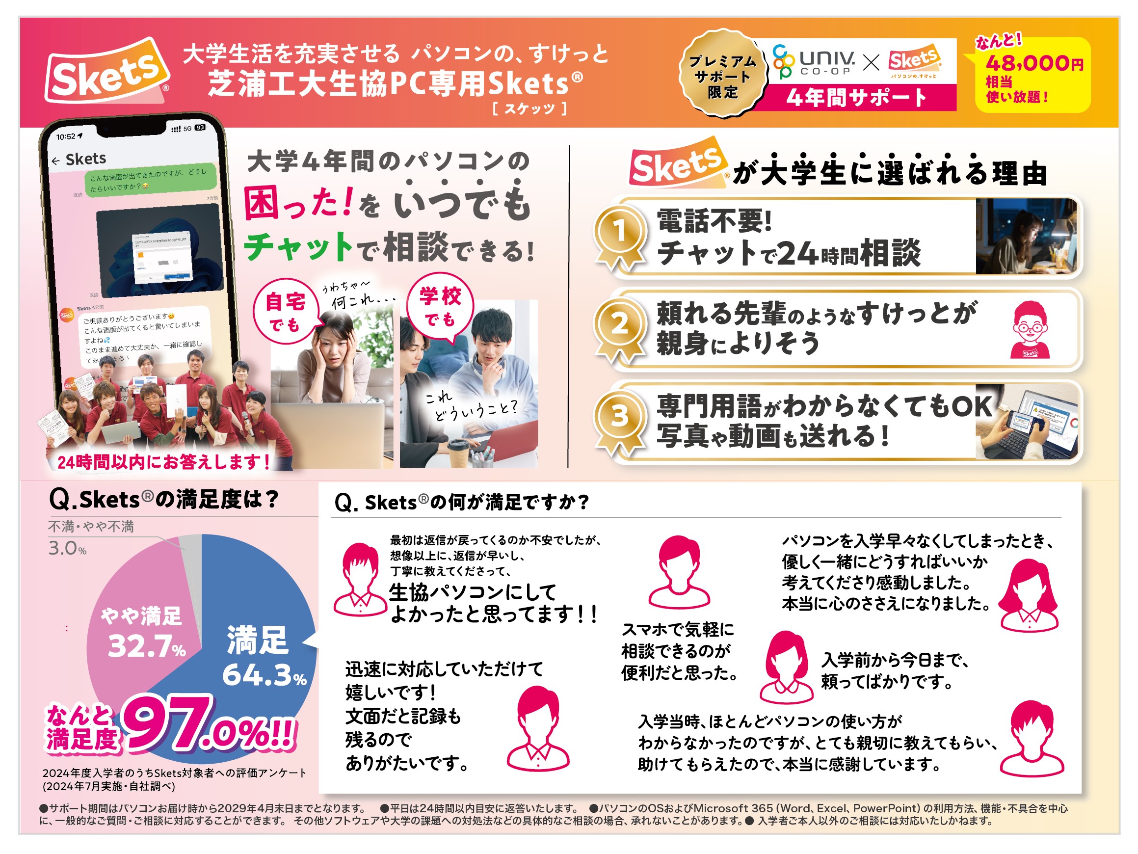 パソコンの困り事をいつでも解決するため、芝浦工大生専用のPCサポートチャットを4年間ご利用いただけます。