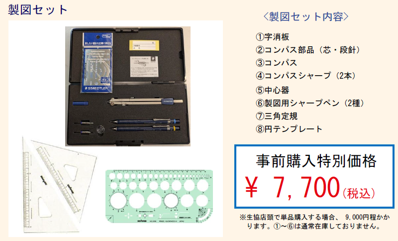 先端機械工学科での製図に必要なセットです。学科の教員と確認して商品を選定しています。
