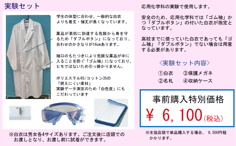 応用化学科での実験に必要なセットです。学科の教員と確認して商品を選定しています。
