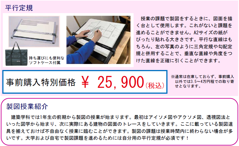 ロボット・メカトロニクス学科での製図に必要なセットです。学科の教員と確認して商品を選定しています。