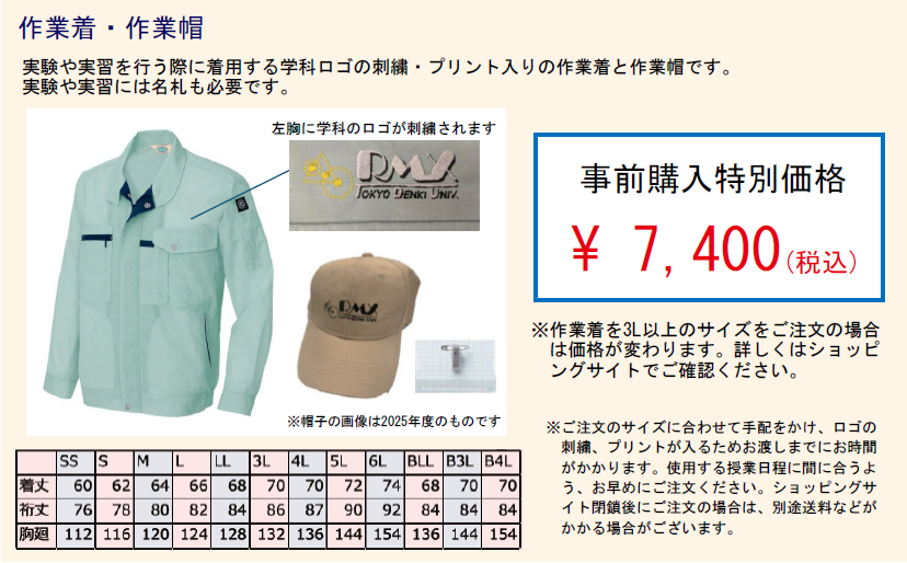 作業着と作業帽はロボット・メカトロニクス学科のロゴ入りオリジナルです。サイズを選んでご購入ください。