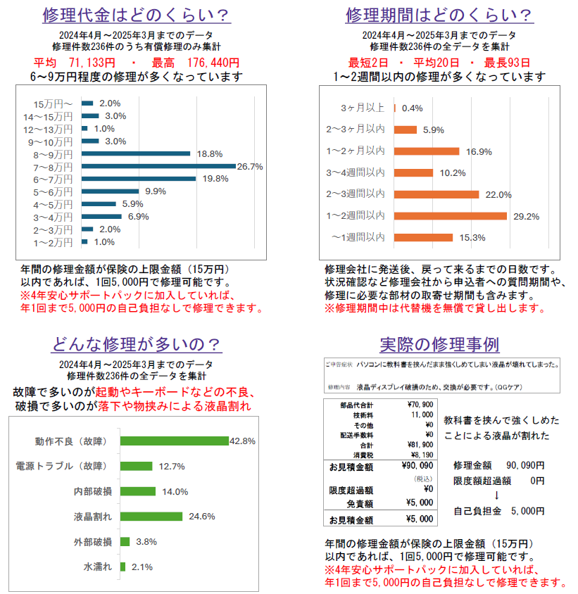 パソコンを持ち運ぶ機会が多い1~2年生のうちは、自然故障よりも破損による修理の発生率の方が高くなっています。(※電大生協調べ) 保証外でメーカーに修理に出す場合、自然故障で2~7万円程、破損・水濡れで2~18万円程費用がかかります。(それ以上かかる場合もございます。)