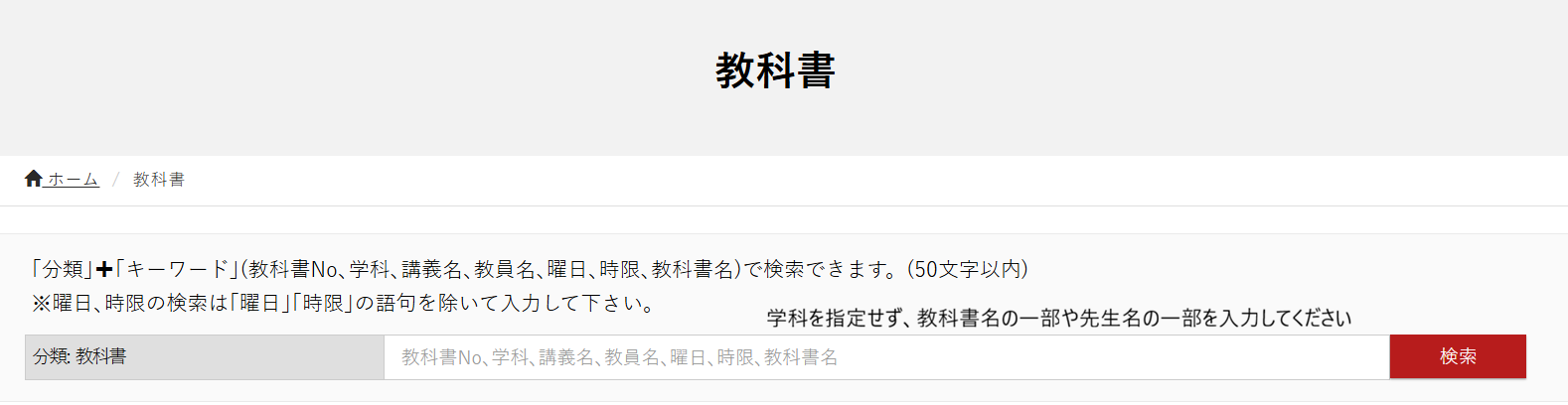 - ・教科書が見つからない場合は、学部学科を指定せず、「科目名の一部」や「先生の名字」「先生のお名前」で検索をお願いいたします。