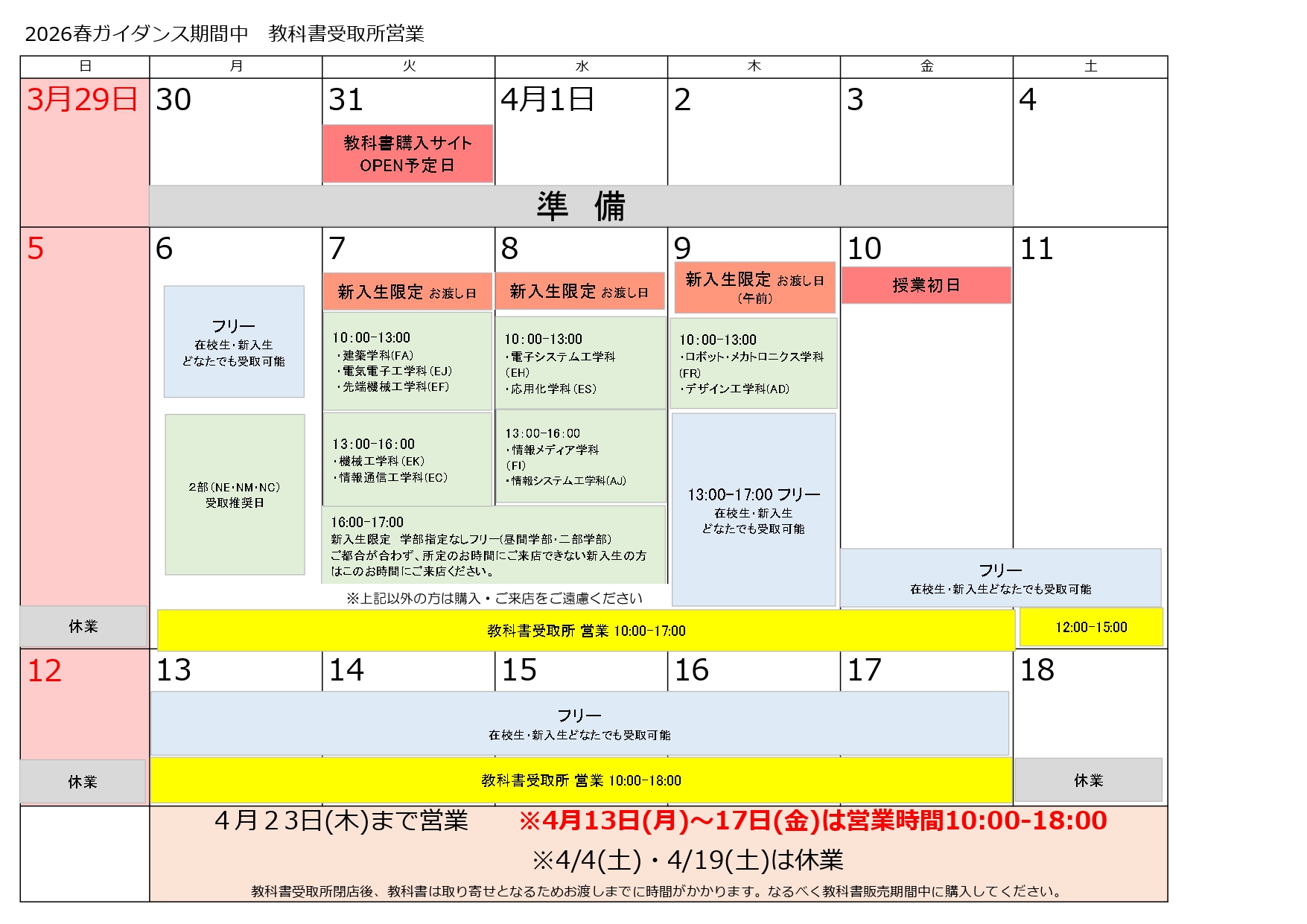 注意:教科書のお受け取り日が下記日程となります。