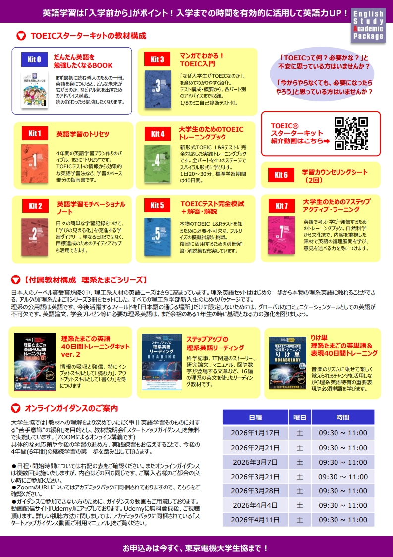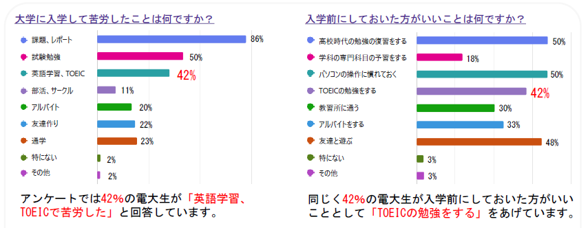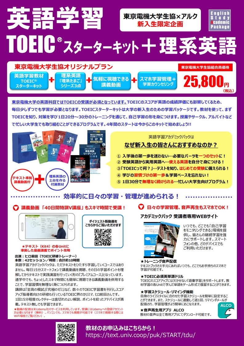この教材は大学の新入生のための学習パッケージで、TOEICを知り、対策を学び1日20~30分のトレーニングを通じて、自己の学習の形を身につけます。授業が忙しい電大生におすすめのプログラムです。