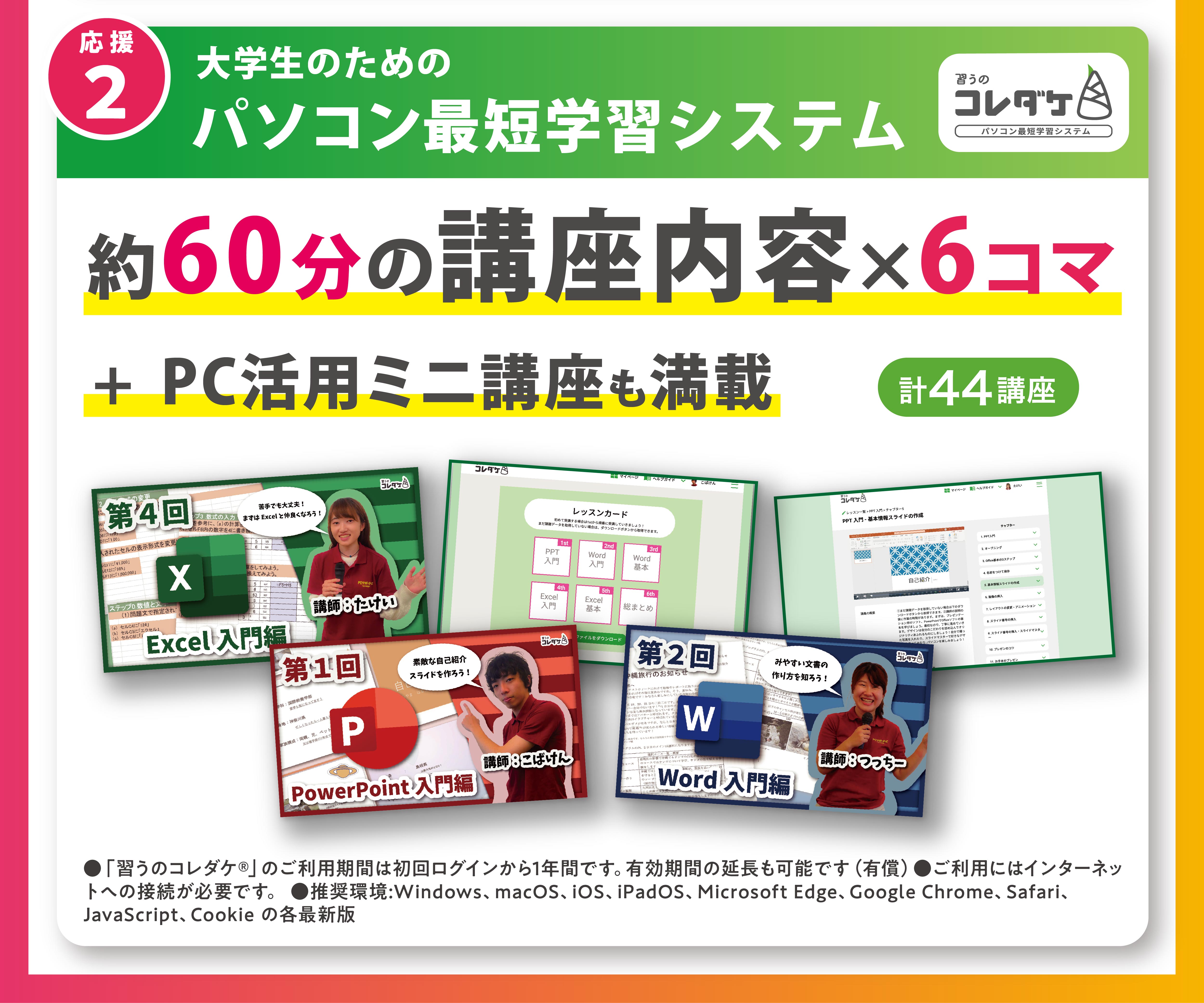 大学生に必要なパソコンスキルが身につく動画サポート。入学前に、Officeの使い方を予習できるし、実際に授業や課題で使い方に詰まることがあっても、動画を見返して復習できます。