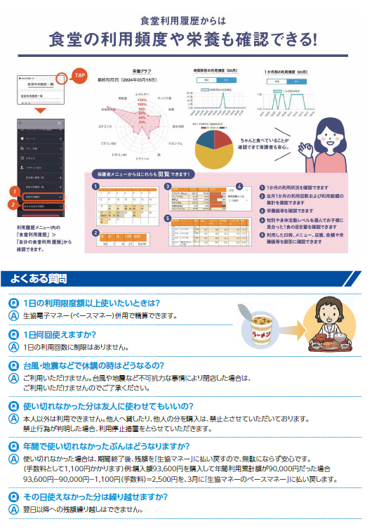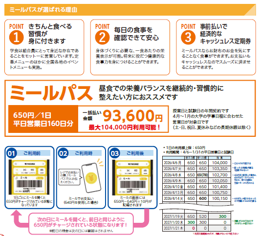 ●利用期間内にて1日の上限額650円(税込)まで生協食堂を利用できます。