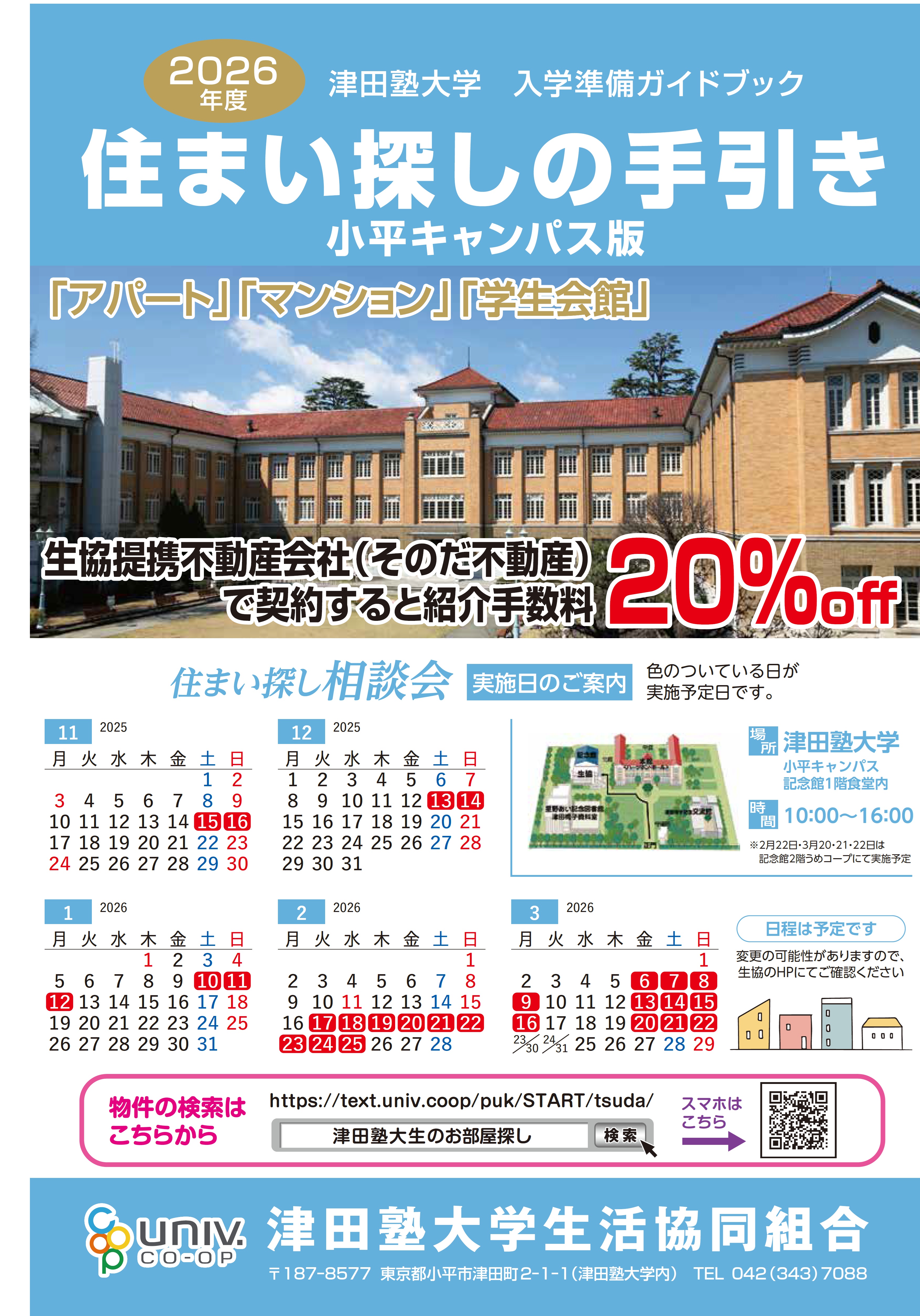 駅及び大学周辺で、住まい・アパートの斡旋紹介の宣伝物を配布している会社がありますが、大学及び大学生協とは関係がありませんのでご注意下さい。