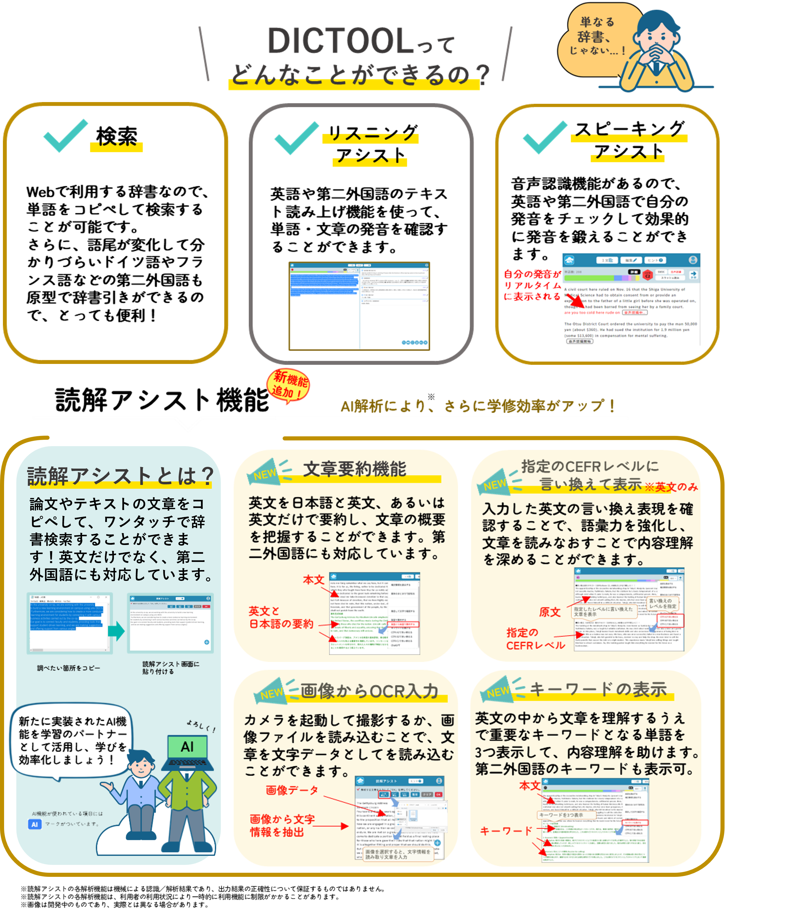 DICTOOL(ディクツール)とは、大学生協が提案する新しい学修ツールです。 ウェブ上のフリー辞書には頼らず、パソコンやスマホでいつでもどこでも!信頼のある辞書で検索・学習することができます。