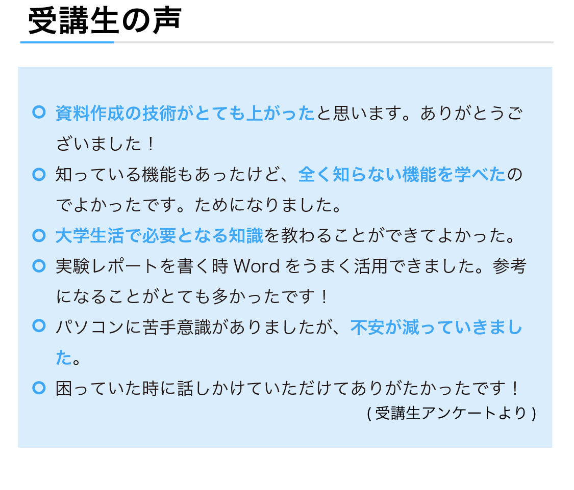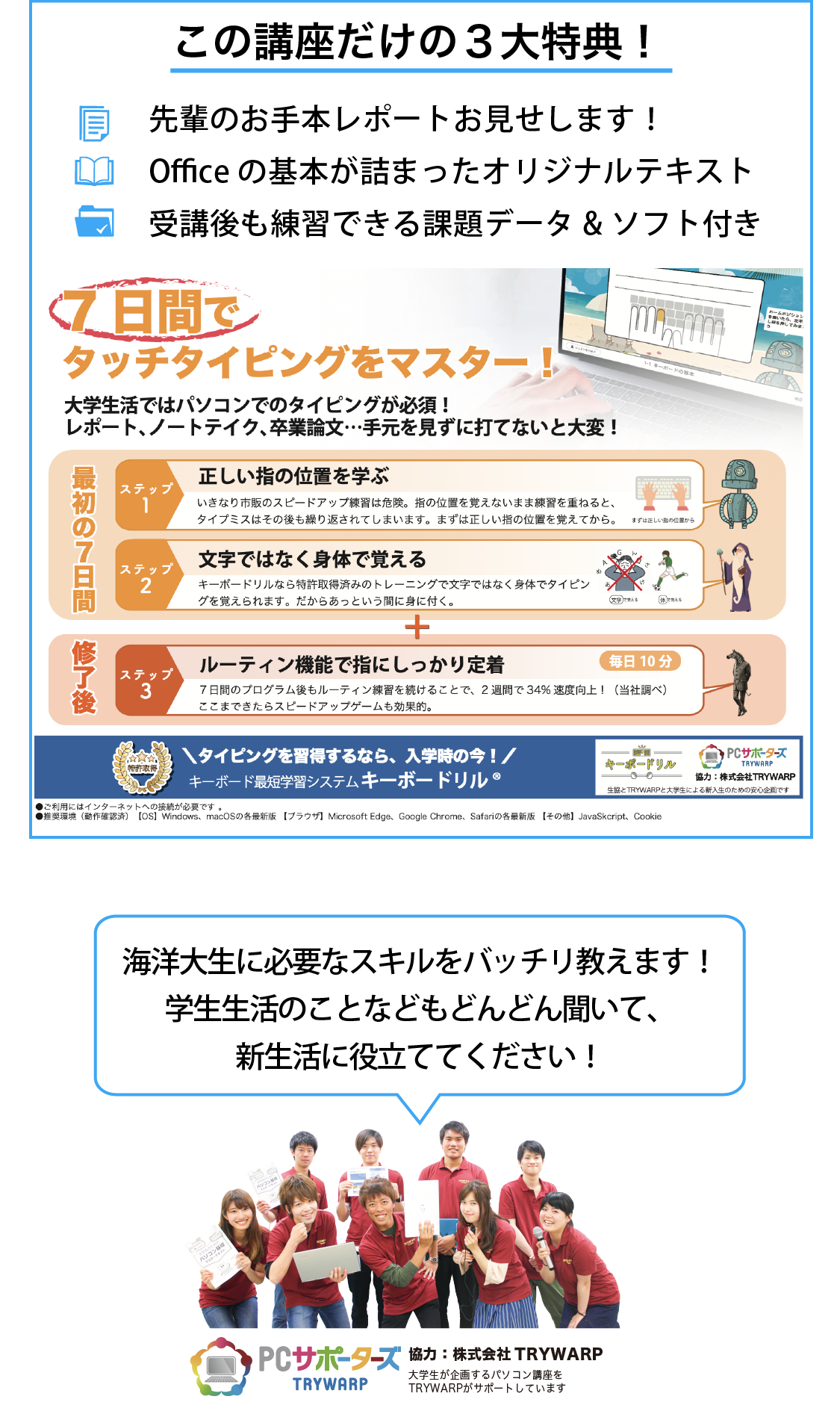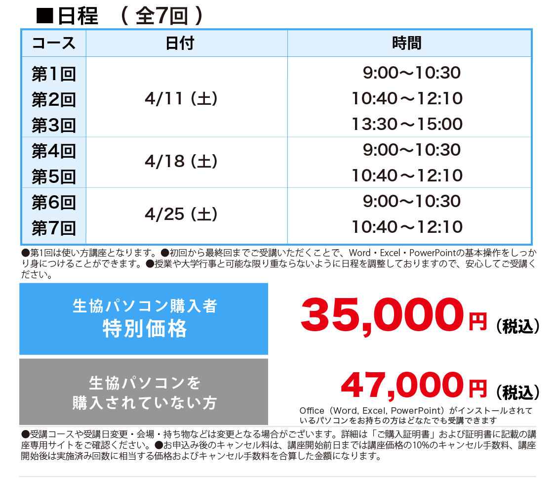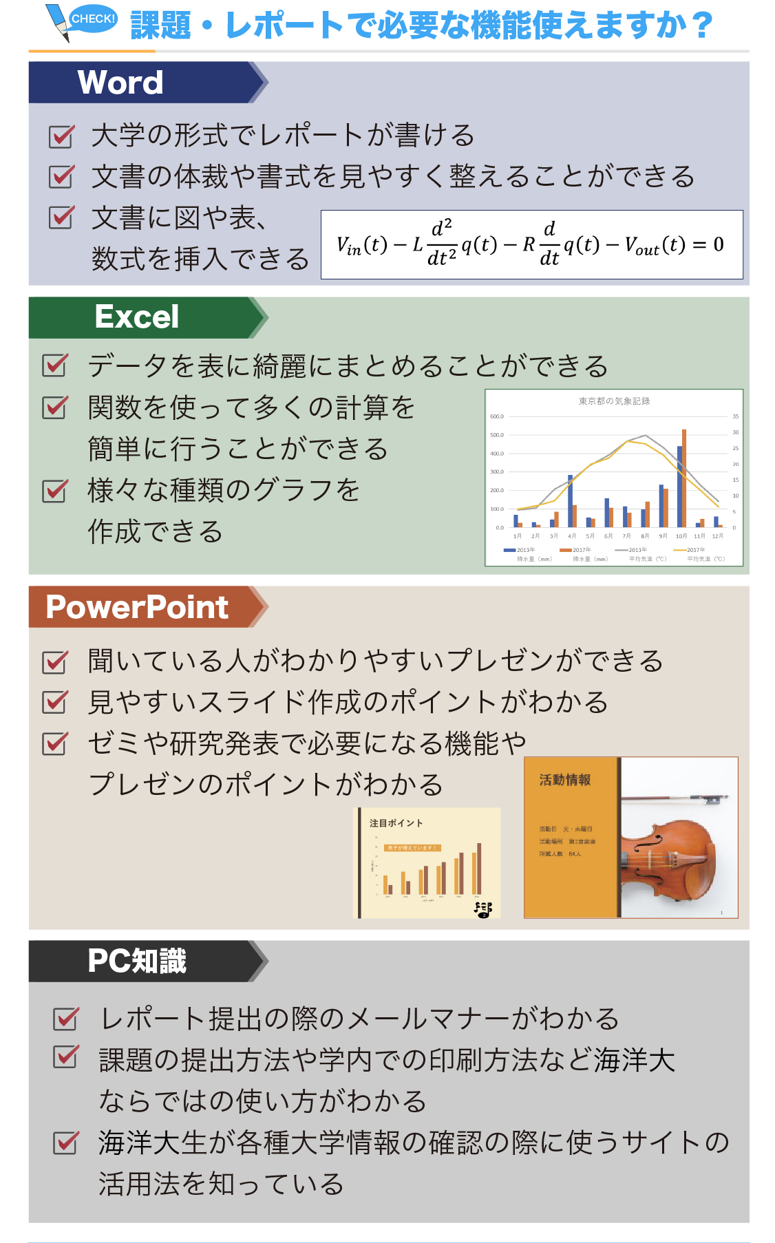 受講の際はパソコン本体とACアダプタをご持参いただき、Officeをインストールの上(ご入学後、大学のアカウンから無料でダウンロード可能となります)ご参加ください