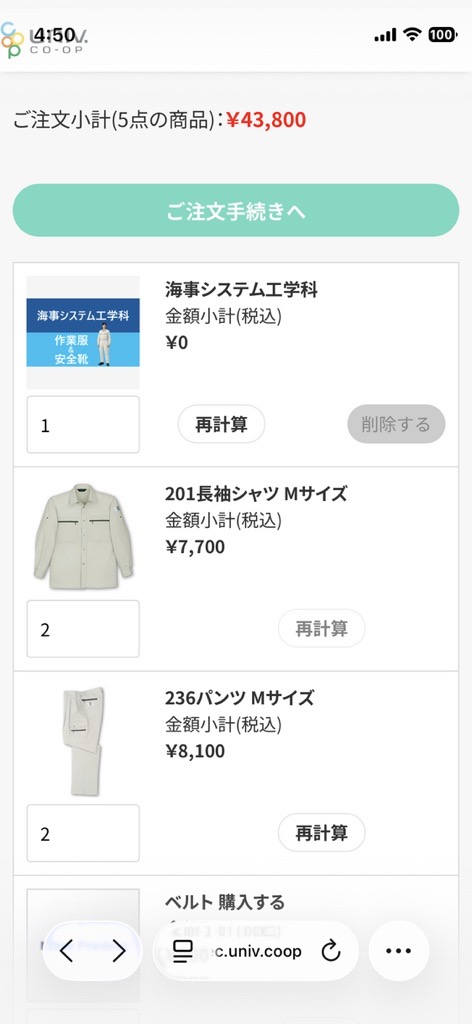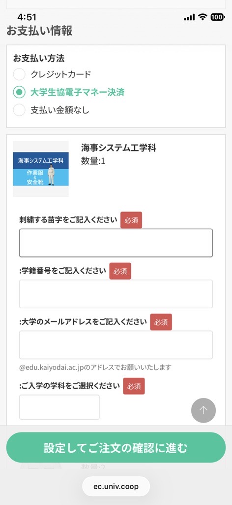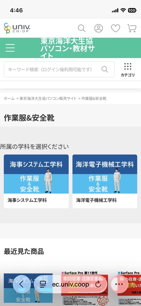 海洋工学部 海事システム工学科と電子機械工学科の2学科の1年生は、4/8(水)~17(金)まで作業服・安全靴の購入期間となります。実習に必要ですので、4/8(水)の試着会にてサイズを確認の上、下記の手順を参考に期限内に専用Webサイトにてご購入をお願いします。