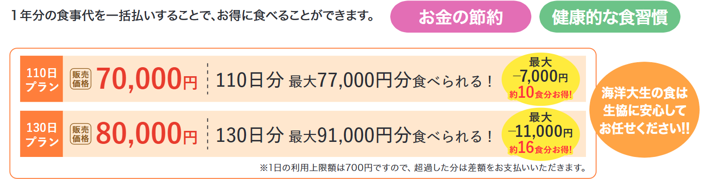 ミールパスは食堂商品専用の年間定期券です。年間の授業及び試験期間、補講日含む生協食堂営業日はいつでも1日の利用限度額(700円)まで、何度でも食堂メニューを利用することができ、利用すればするほどお得な経済的なマネーです。