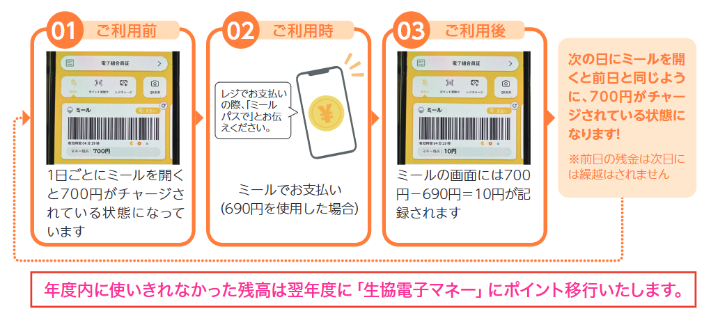 使い切れなかった場合は、期間終了後、残額を「生協マネー」に払い戻すので、無駄にならず安心です。