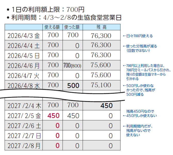 ▶食堂営業日には、110日分(77,000円分)・130日分(91,000円)を使い切るまで毎日一定額が必ずチャージされるので、食費の確保やお財布の中身を気にすることがなくなります。