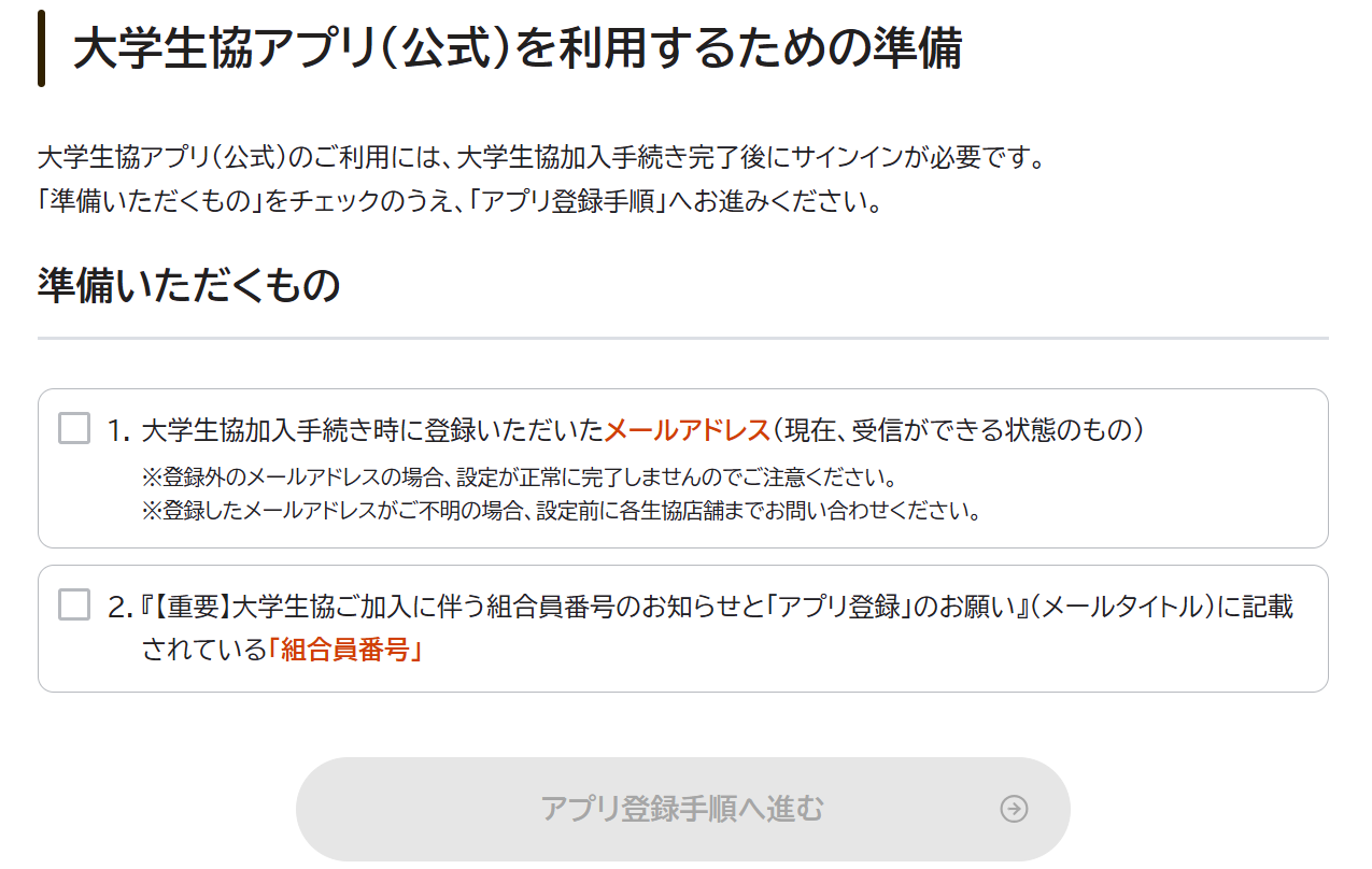 - 加入手続き時にメールアドレスを登録していない方は、『【重要】大学生協ご加入に伴う組合員番号のお知らせと「アプリ登録」のお願い』(メールタイトル)が送信されません。まずは直接生協店舗へお問い合わせをいただき、店舗でのメールアドレス登録からお願いいたします