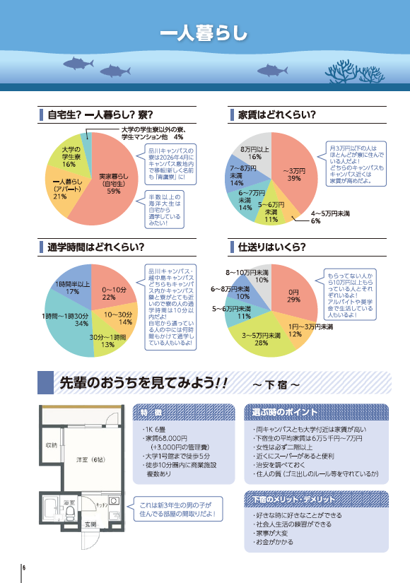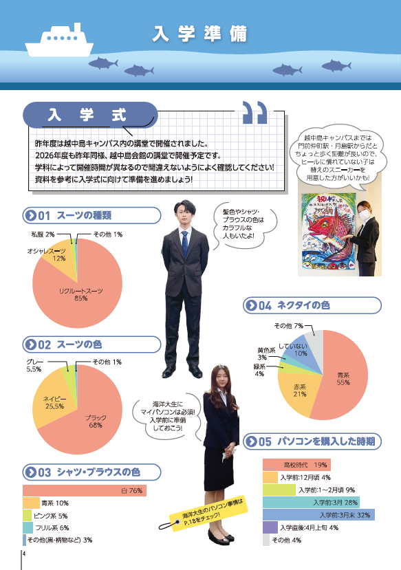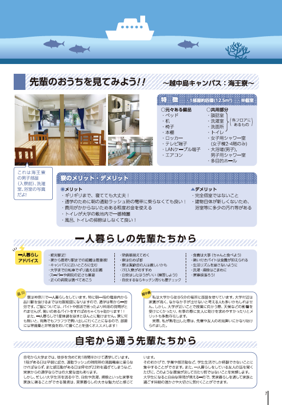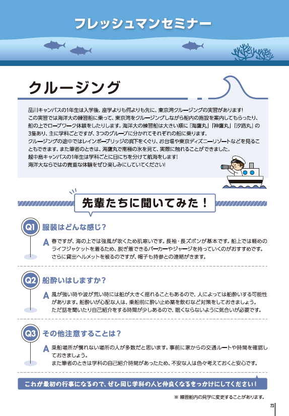本編にはこれから参考になる海洋大生の1日の過ごし方や履修登録の参考に!各学科の1年生の先輩達の時間割の一例やサークル・アルバイトについて、先輩からのアドバイスなど内容が掲載されています。ぜひご覧ください!