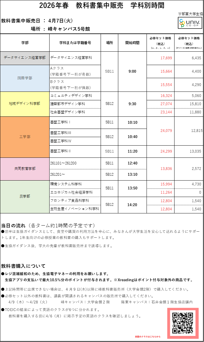 【教科書の買い方 ③必修教科書集中販売・生協ガイダンスに参加して、必修セットを購入】から事前に金額をご確認ください。