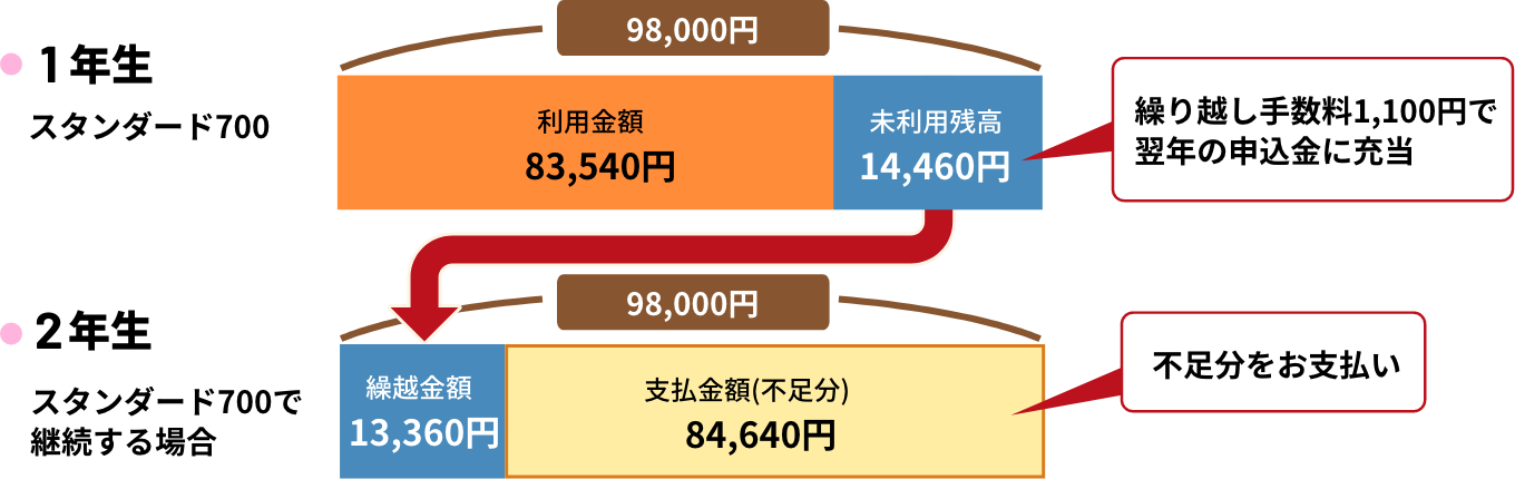 年間の利用額が、年初のお支払金額に満たなかった場合は、差額を翌年の申込代金に充当することができます(繰越手数料1,100円がかかります)。