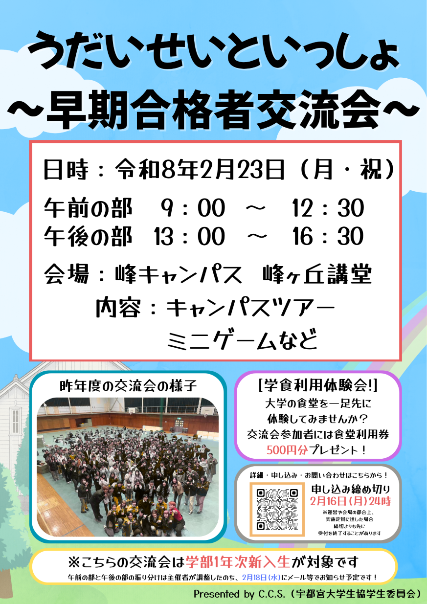 C.C.S.(宇都宮大学生協学生委員会)では早期合格者を対象とした交流会を開催します。