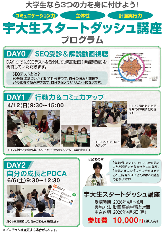 宇大生スタートダッシュ講座に参加して「一歩前に出る力」を身につけよう!
