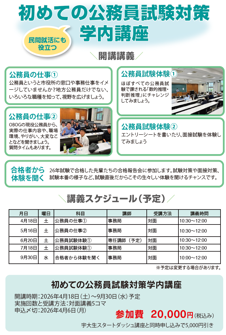 【確認事項】単体申込 税込20,000円(宇大生スタートダッシュ講座との同時セット申込 税込15,000円)