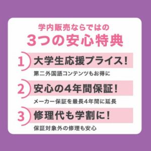 学域卒業までの4年間、安心してご利用いただくために、メーカー保証を4年間に延長しました。
