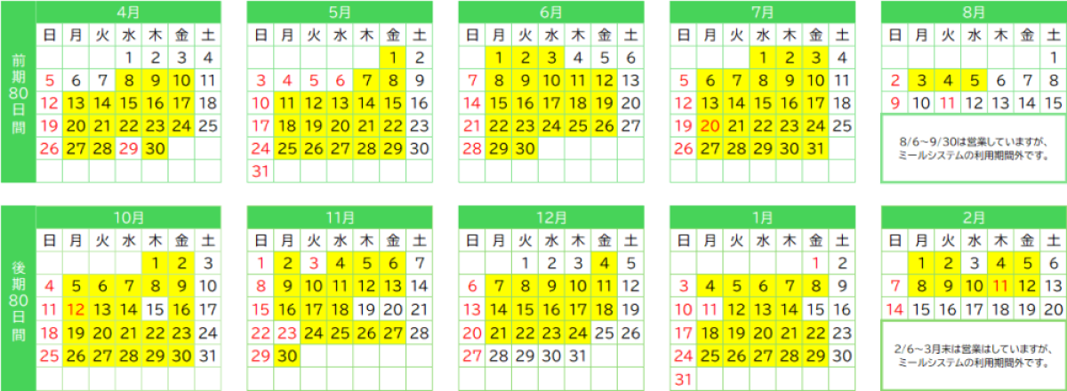 ※土・日を除く※祝日などの変動により授業日、ミールシステム利用可能日が変更になる場合があります。