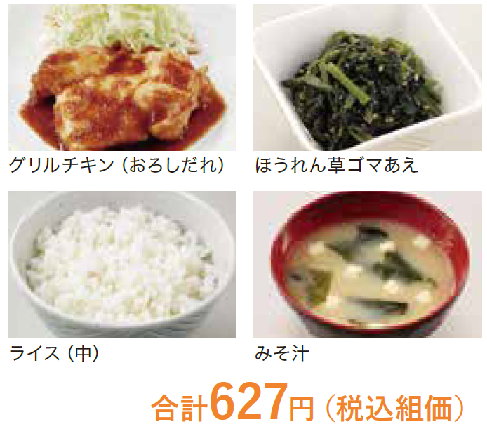 ライス中+みそ汁+グリルチキン+ほうれん草ゴマあえ= 627 円