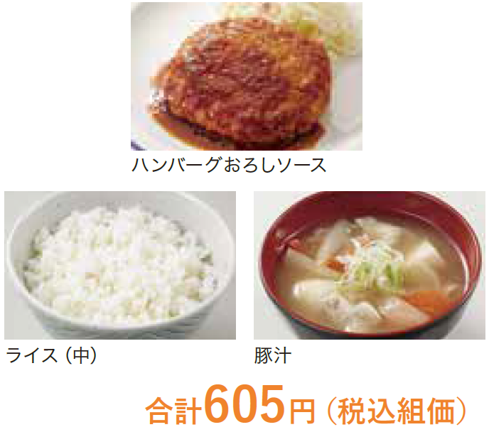 ライス中+豚汁+ハンバーグおろしソース= 605 円