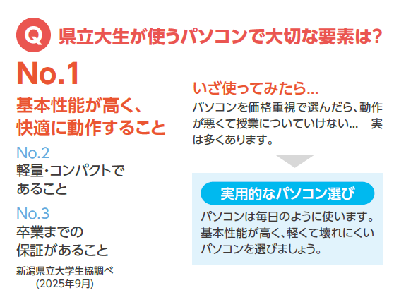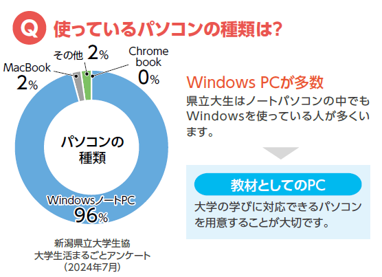 本学では、オンライン授業を活用している授業科目が幾つかあったり、大雪で公共交通機関がマヒした場合に大学全体がオンライン授業に切り替ったりなど、学生が自宅でPCを使ってオンライン授業を受ける場合があります。また、国際経済学部では、情報・データ分析能力を高めることを教育目標の重要な柱の一つとしているため、学生は統計データをインターネットからダウンロードしそれを加工して分析を行ったりします。したがって、こうした使用に耐えられるような、学部や大学が推奨するスペックのパソコンの購入をお勧めします。
