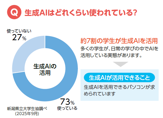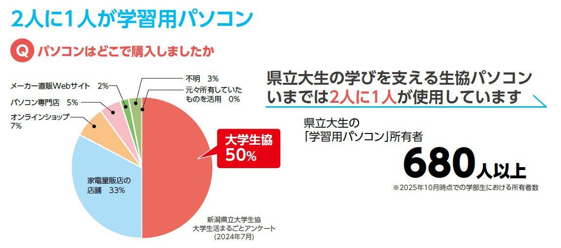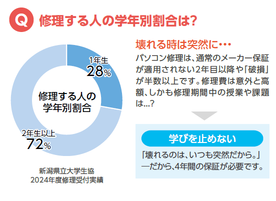 子ども学科 小澤 薫 先生大学生活では、自分専用のパソコンは学びの必需品です。授業やレポート作成はもちろん、実習先に持参して報告資料を作成する場面もあります。大学生協のパソコンは、こうした学修に必要な性能を備え、卒業研究まで安心して使えるスペックです。万一トラブルが起きても、生協窓口で気軽に相談・修理対応ができるのも大きな利点です。さらに4年間の保証付きで、大学生活を通して安心して活用できます。