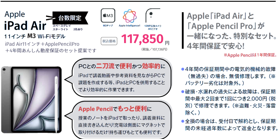 - 生協の安心iPadセット iPad Air+ApplePencilPro+動産保険+GoodNotes6トライアル3カ月